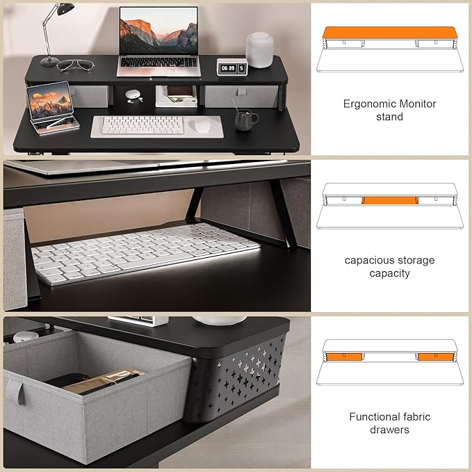 - [Standing Desk with Drawers]: This small standing desk features dual fabric drawers and open shelves for storing a variety of items (pens, keyboards, accessories), maximizing desk space while concealing clutter.