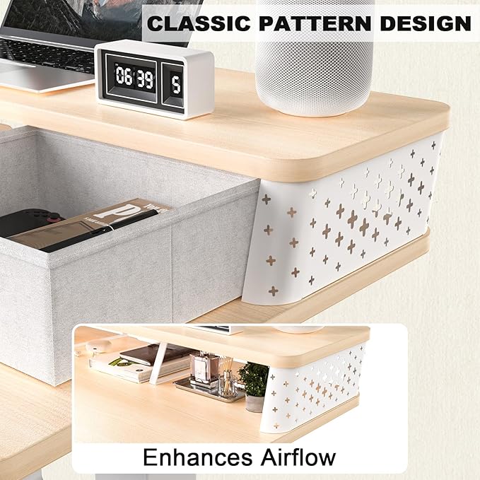 - [Standing Desk with Drawers]: This small standing desk features dual fabric drawers and open shelves for storing a variety of items (pens, keyboards, accessories), maximizing desk space while concealing clutter.