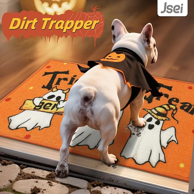 - Halloween Fun Doormat: Bright orange 17''x30'' mat features 3 cute and flying ghosts with "Trick or Treat" text. Perfect as a Halloween decor when you entering the front door.The festive design instantly boosts your entryway's spooky atmosphere