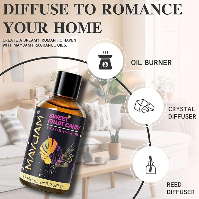 - Widely Use: Except to be used in diffuser to provide delightful scent to any space, MAYJAM fragrance oils for diffuser could also be used in making soap, candle, room spray, bath bomb to bring the charm of Sweet Fruit Candy into every corner of the life