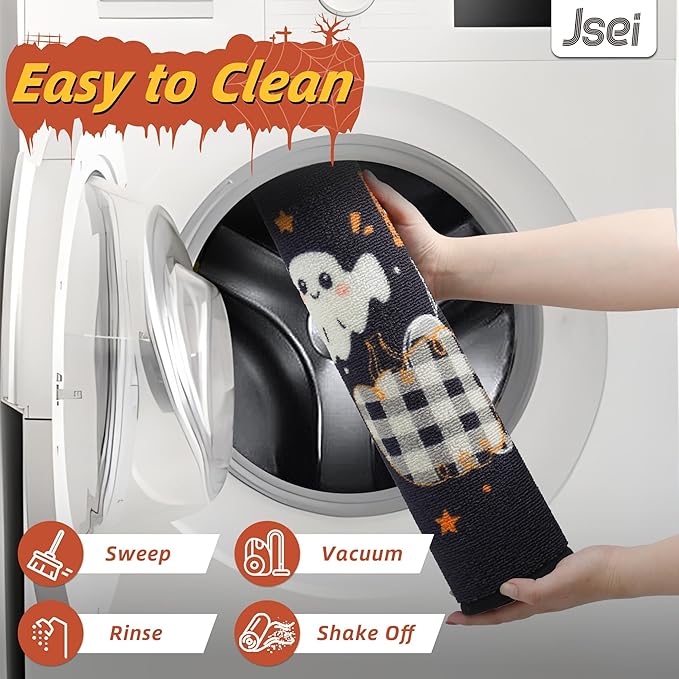 - Halloween Fun Kitchen Mats: Black 17''x30''+17''x48'' mats features flying ghosts and pumpkins with "Halloween" text. Perfect as a Halloween decor when you working in the kitchen. The festive design instantly boosts your kitchen's spooky atmosphere