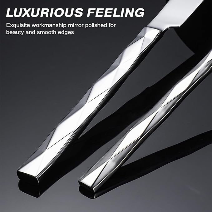 - 【Diamond-Infused Elegance】Fancy silverware set featuring prismatic handles with diamond-cut facets, casting dazzling light reflections. Elevate casual dinners to five-star experiences with this modern silverware set’s museum-worthy artistry