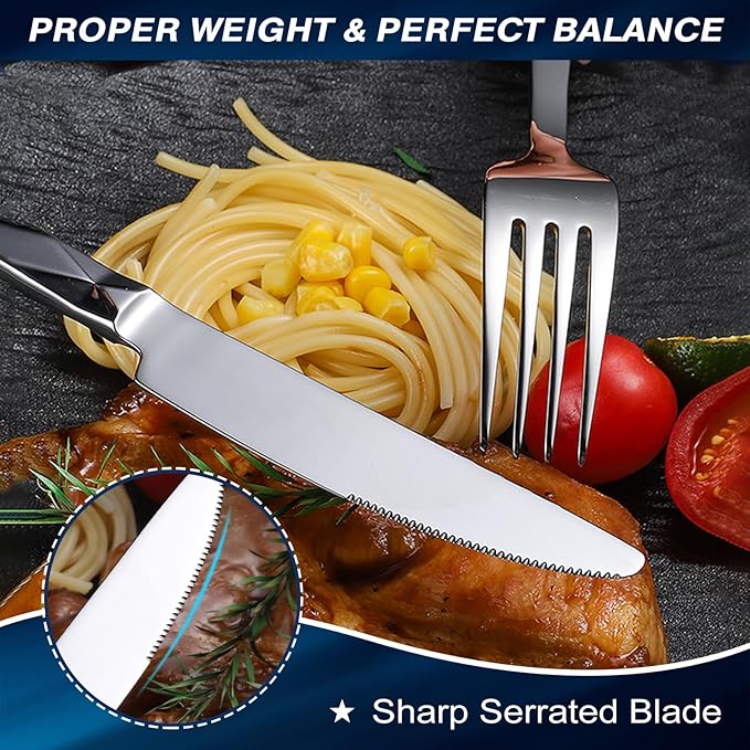 - 【Engineering Excellence】High-density stainless steel silverware set features weighted ergonomic handles. Diamond-cut edges prevent slipping, while heat-forged cores resist bending – defining luxury in silverware sets designed for lifetime use