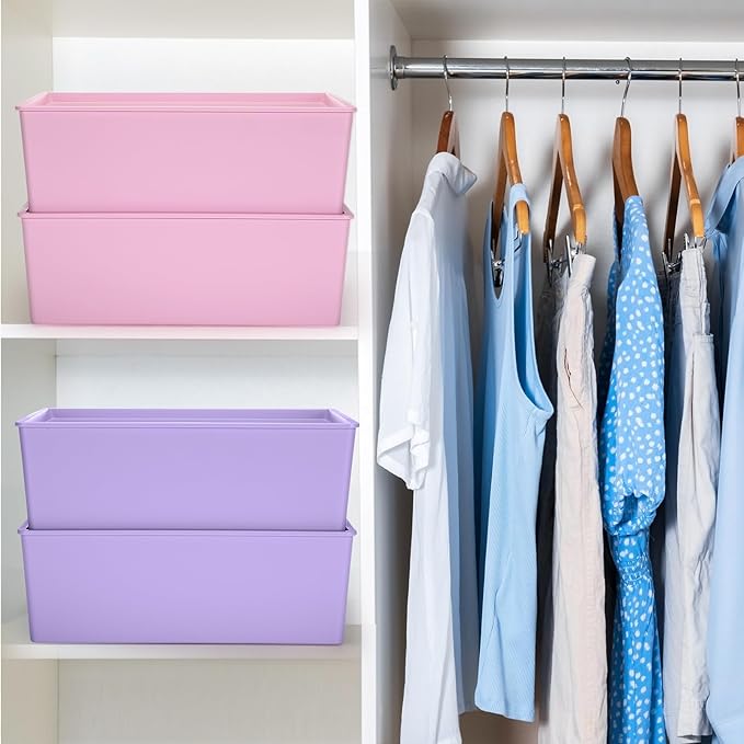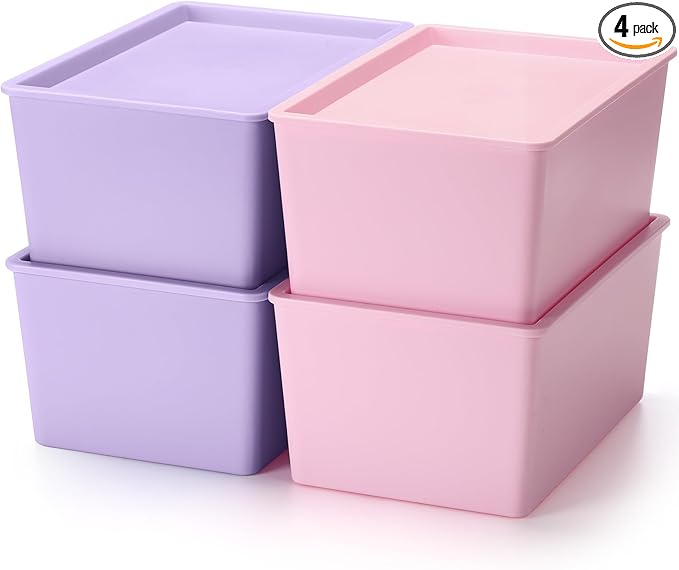 Menkxi 4 Pcs Storage Bins with Lids Plastic Containers Stackable Storage Box Baskets for Organizing Shelves (Pink, Purple,Large)