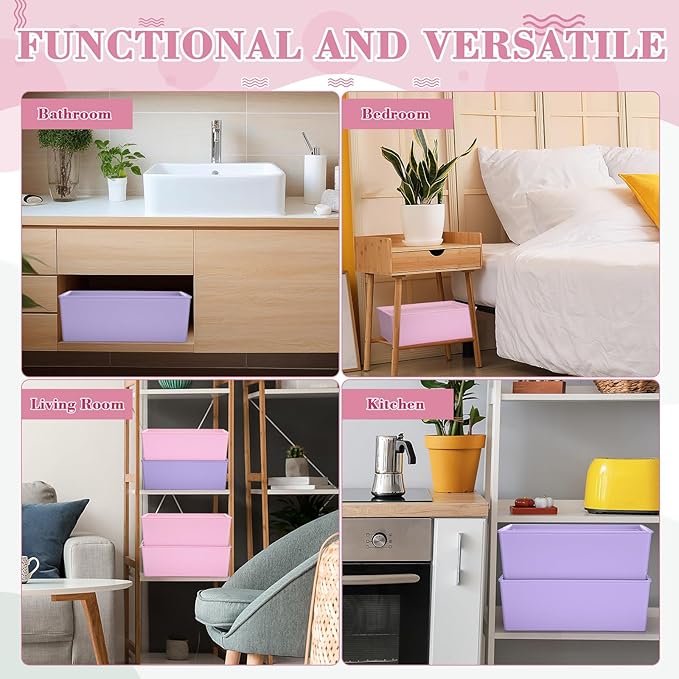 - Ample Quantity and Proper Size: you will receive 2 pink and 2 purple large plastic containers with lids, each one measuring about 14.4"L x 10.4"W x 5.1"H; Sufficient quantity and proper size will cater to your daily storage requirements efficiently, keeping your belongings organized, bringing convenience, and adding a colorful touch to your life; And you can share them with your family or friends