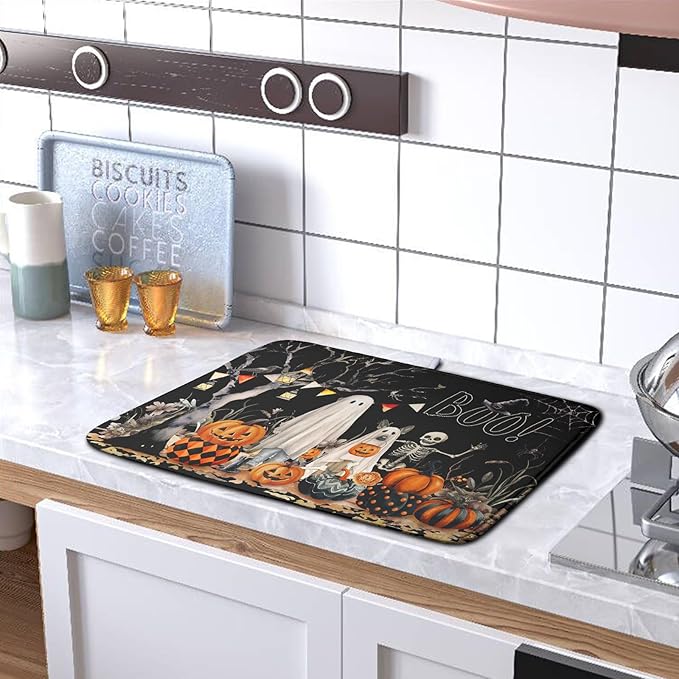 - Ultra Absorbency: The surface of the halloween drying mat for kitchen counter is made of absorbent microfiber and the middle is made of composite sponge, absorbs 4X its weight in water, keep your counter dry. Absorbent, Colorful, Reversible, do not fade
