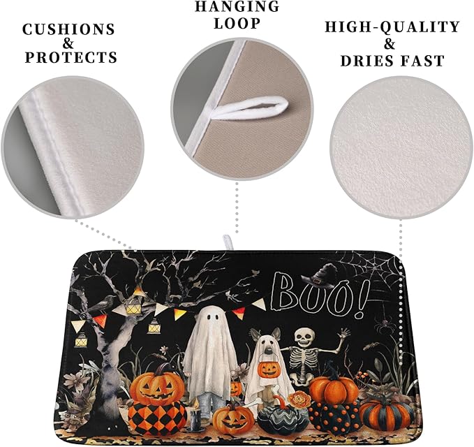 - Multifunctional Pad: Beautiful print on surface side, and reverses to a solid color. The fall halloween dish drying mats for kitchen counter absorbs water well, great for air drying dishes, glasses, bottles, silverware, fruits and vegetables, adds stability when drying fragile items