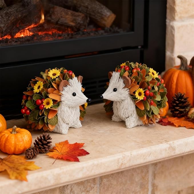 - Natural & Textured Materials: Crafted with a body made of woodchips and berries, plus cute straw face, these hedgehog figurines boast a rustic, handcrafted look. The combination of natural elements adds warmth and texture, enhancing its cozy fall appeal