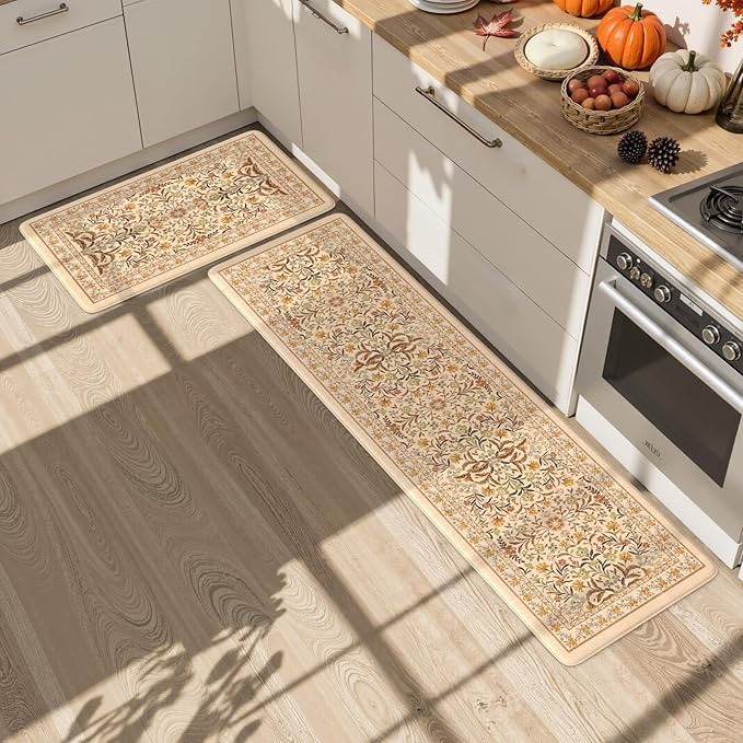 Collive Anti Fatigue Mats for Kitchen Floor, Cushioned Fall Kitchen Mat Comfort Waterproof Padded Sink Rugs Non Slip, Boho Orange Floral Standing Rug for Office, Autumn Home Decor, 17"x29"+17"x59"