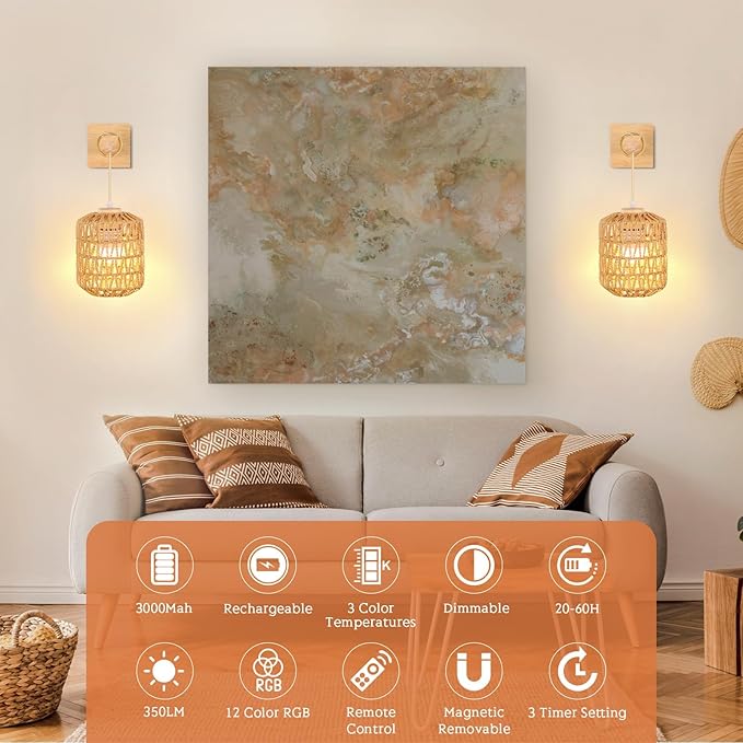 - 【Battery Powered wall sconce Set of 2】this rattan wall sconce comes with 2 rechargeable LED bulbs, 3000mAh high capacity battery, lighting time up to 18-50 hours, wireless wall sconce allows you to be free of wiring troubles, can be installed in any place without hard wiring. They can be easily recharged with 2 Type-C cables in the package!