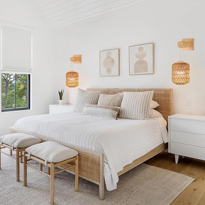 - 【Easy to install】this rattan rechargeable wall lights requires no plugging in, no wiring, just fix the base on the wall and install the rechargeable bulb, then you can use the remote control to turn on and control the light, very Convenient! Included in the package are 2 rechargeable bulbs, 1 remote controls, 2 USB charging cables (Type-C), mounting screws, 1 installation instructions. options! We have also kept the hardwired option to make the wall sconces more selective!