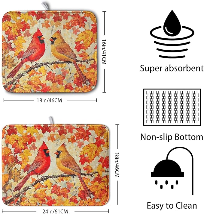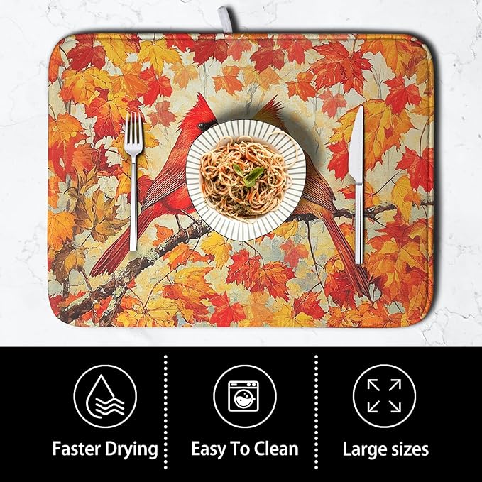 Fall Dish Drying Mats for Kitchen Counter Maple Leaf Cardinal Birds Dish Draining Mat 18x24 Inch Autumn Thanksgiving Dish Rack Mat Microfiber Absorbent Dish Drainer Pad
