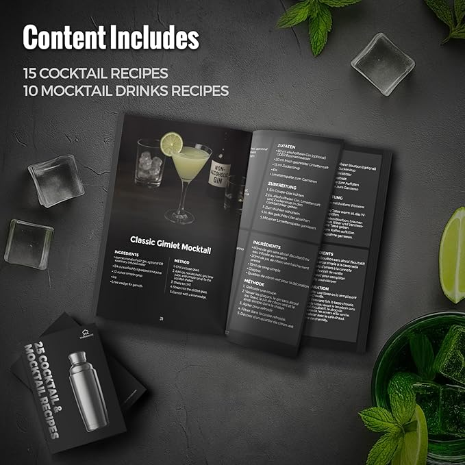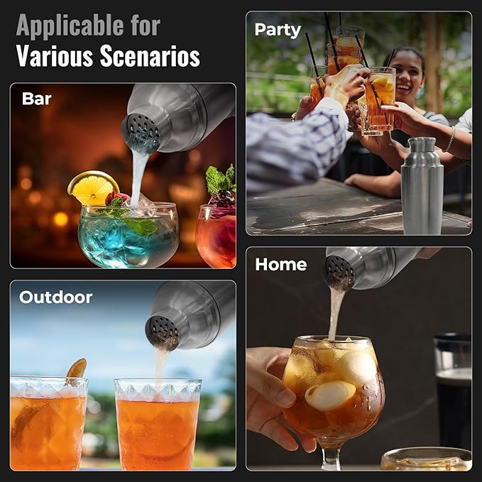 - 【Built-in Strainer for Effortless Mixing】: This Cocktail Shaker with Strainer allows smooth, mess-free pouring without extra filters. Simply measure spirits with the jigger, muddle fruits, and shake your margaritas or martinis with confidence. Even beginners can create bar-quality cocktails thanks to the included recipes and ergonomic design.