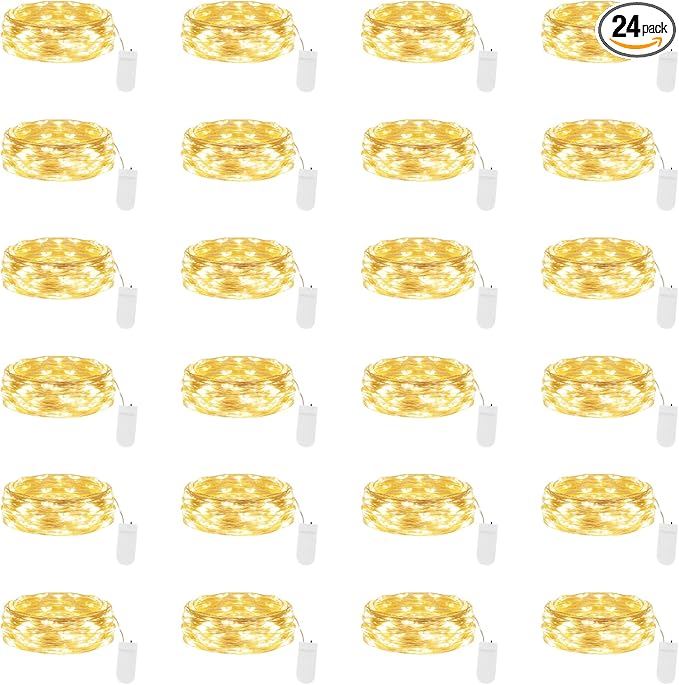 - 【24-Pack Battery Operated String Lights】 Powered by 2 CR2032 batteries, these fairy lights are equipped with 20 energy-efficient micro LEDs that are perfect for use in mason jars, wine bottles, vases, DIY crafts, wreaths, centerpieces, or gift wrapping. Ideal for cozy evenings, festive holidays, or romantic celebrations, a soft and magical glow is effortlessly created, transforming ordinary moments into unforgettable memories