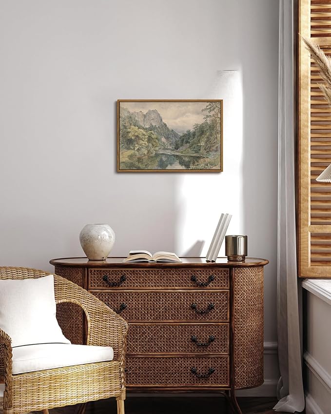 KISSFOX Vintage Framed Wall Art River Valley Landscape Canvas Wall Art Mountain Stream Natural Serene Countryside Paintings Artwork Rustic Art Prints For Bedroom Bathroom Living Room