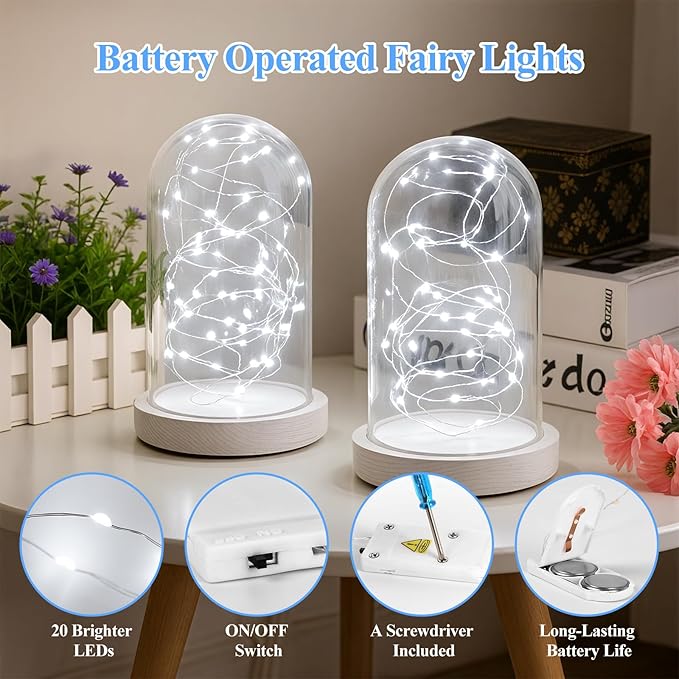 - 【6-Pack Battery Operated String Lights】 Powered by 2 CR2032 batteries, these fairy lights are equipped with 20 energy-efficient micro LEDs that are perfect for use in mason jars, wine bottles, vases, DIY crafts, wreaths, centerpieces, or gift wrapping. Ideal for cozy evenings, festive holidays, or romantic celebrations, a soft and magical glow is effortlessly created, transforming ordinary moments into unforgettable memories