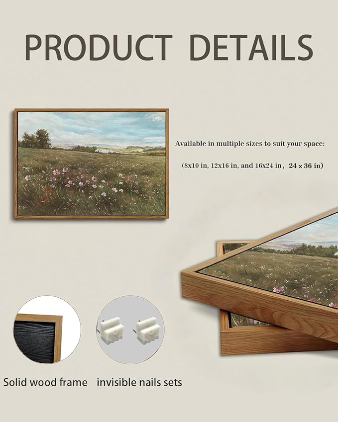 - Floral Field Landscape Decor: Bursting with colorful tones—from vivid pinks of the blooms to warm greens of the grass and soft blues of the sky—this wall art complements diverse spaces. Perfect for bedroom decor to add a tranquil vibe, bathroom to bring a touch of nature, or living room to create a rustic farmhouse atmosphere. Whether your home has a modern or classic style, its vintage floral charm fits right in.