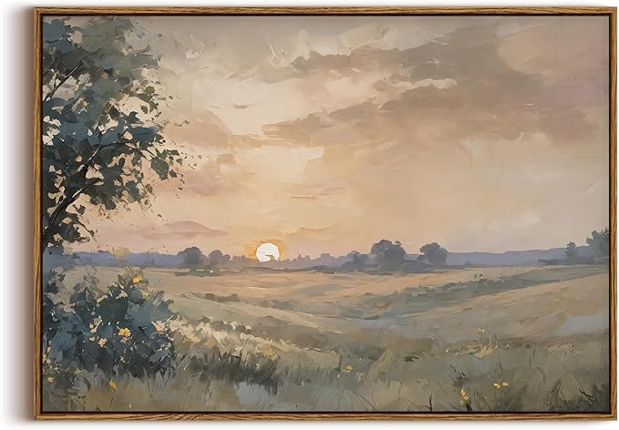 KISSFOX Vintage Framed Wall Art Sunset Landscape Canvas Wall Art Neutral Farmhouse Serene Countryside Paintings Artwork Rustic Art Prints For Bedroom Living Room