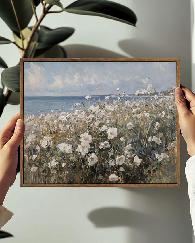 KISSFOX Vintage Floral Framed Wall Art Coastal Rose Wildflower Canvas Wall Art Neutral Farmhouse Serene Countryside Paintings Artwork Rustic Art Prints For Bedroom Living Room