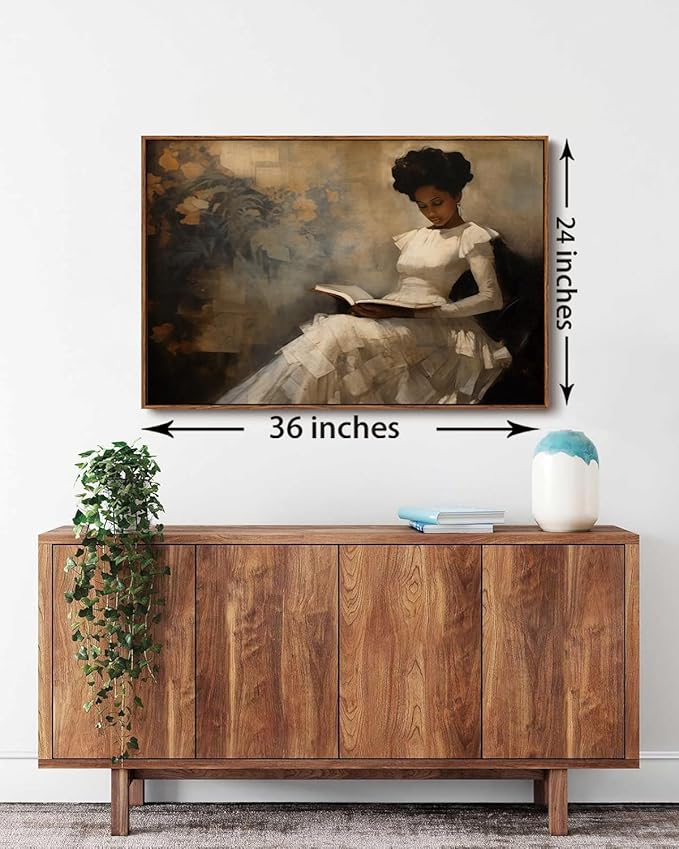 KISSFOX Vintage Portrait Framed Wall Art African American Canvas Wall Art Neutral Rustic Woman Reading Paintings Artwork Serene Countryside Art Prints For Bedroom Living Room