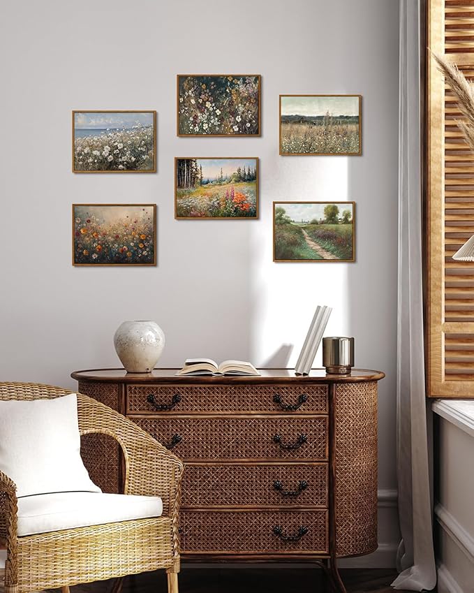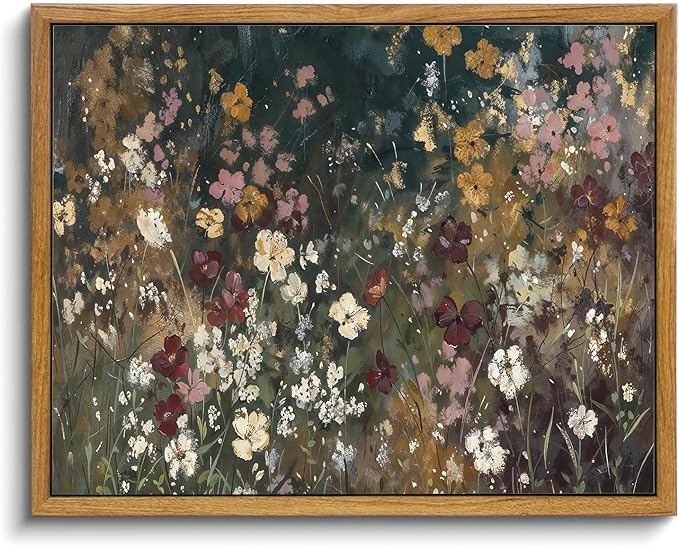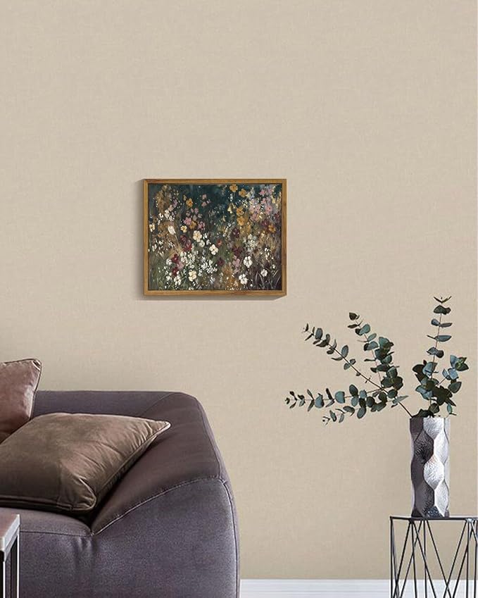 KISSFOX Vintage Floral Framed Wall Art Moody Wildflower Field Canvas Wall Art Neutral Farmhouse Serene Countryside Paintings Artwork Rustic Art Prints For Bedroom Living Room