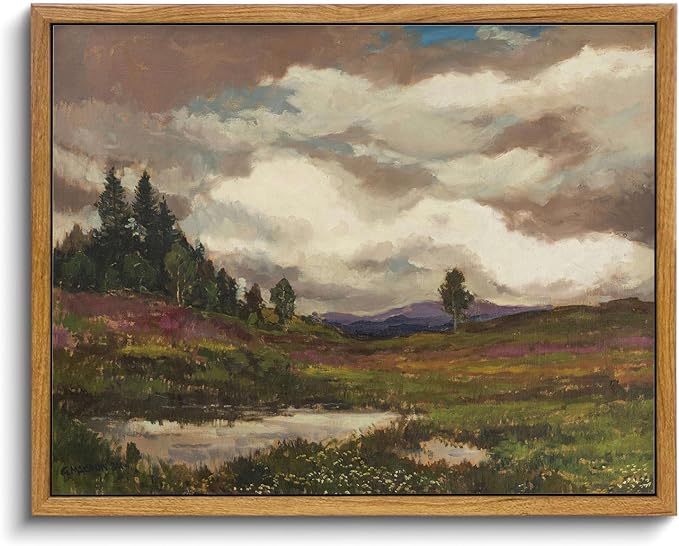 KISSFOX Vintage Landscape Canvas Wall Art Farmhouse Hills Pond Clouds Framed Wall Art Natural Countryside Paintings Artwork Rustic Art Prints For Bedroom Bathroom Living Room