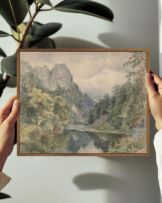 KISSFOX Vintage Framed Wall Art River Valley Landscape Canvas Wall Art Mountain Stream Natural Serene Countryside Paintings Artwork Rustic Art Prints For Bedroom Bathroom Living Room