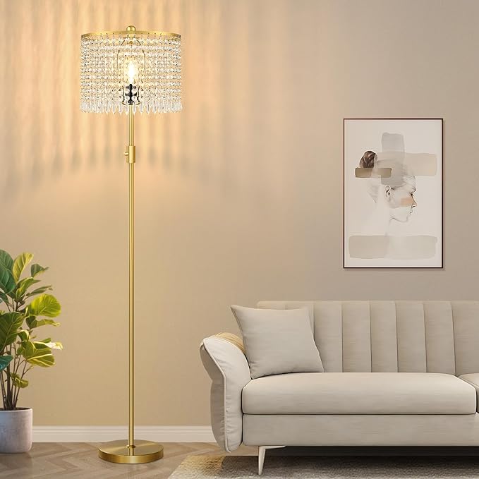 【Upgraded】 Floor Lamps for Living Room, 1000LM LED Bulb Included, Dimmable Standing Lamp with Crystal Lampshade, Tall Gold Pole Light for Bedroom Nursery Office Corner Reading