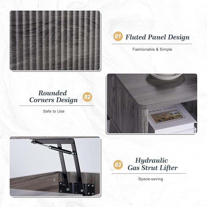 LYNCOHOME Fluted Lift Top Coffee Table with Storage,Modern Center Table for Living Room, Home Office(Grey)