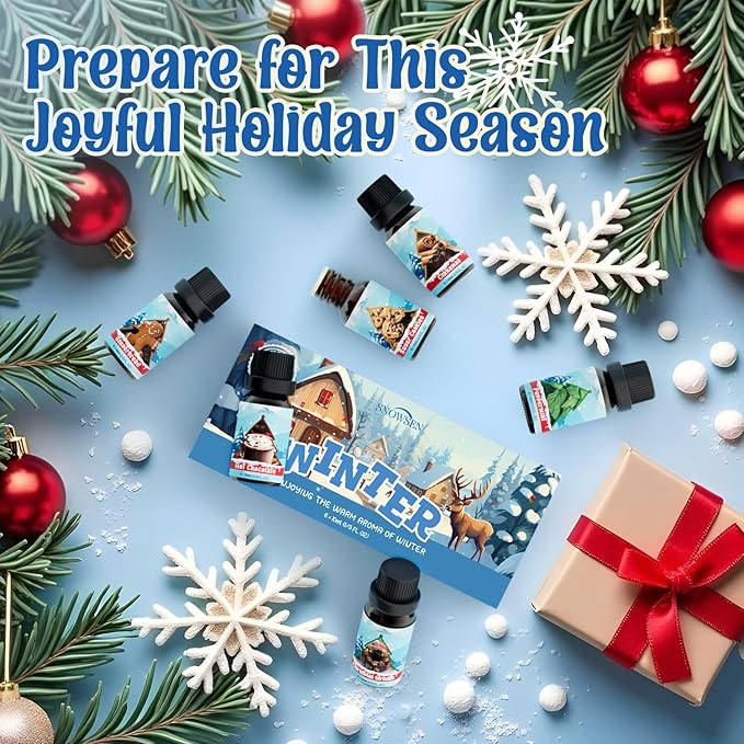 - Cozy Winter Collection: SNOWSEN winter essential oil set includes 6 x 10ml fragrance oils: Christmas Wreath, Gingerbread, Sugar Cookies, Hot Chocolate, Peppermint, and Cinnamon. A delightful blend that captures the festive season in every drop.