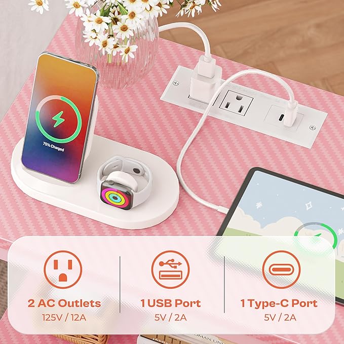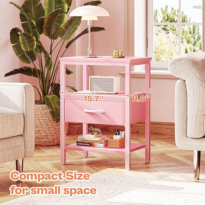 - [Go for a Long Time]: Pink wooden grain shelves, fabric and metal frame blend white handles, making it a stylish piece. Sturdy P2 particle board, sturdy metal frame, and durable fabric drawer, all these work excellently to give this side table with charging station strong support