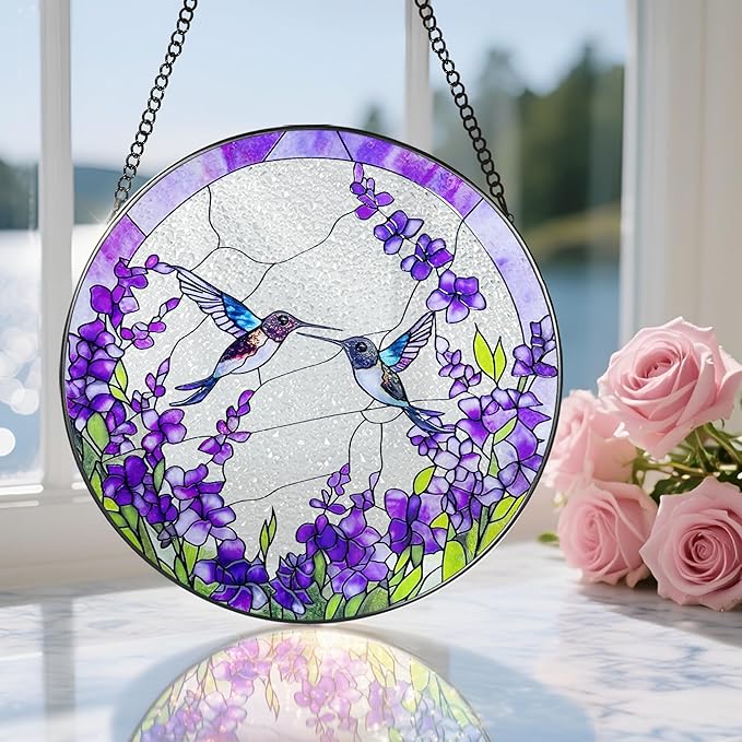 8 Inch Hummingbirds Among Lavender Flowers Stained Glass Suncatcher, Wall Art, Window Hanging, Indoor Decor, Gifts for Women, Sun Catcher