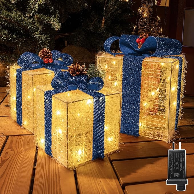 Christmas Decorations, Set of 3 Christmas Lighted Gift Boxes, Pre-lit 60 LED Light Up Present Boxes Warm White Xmas Ornaments for Indoor Outdoor Yard Lawn Home Decor (Blue Bow)
