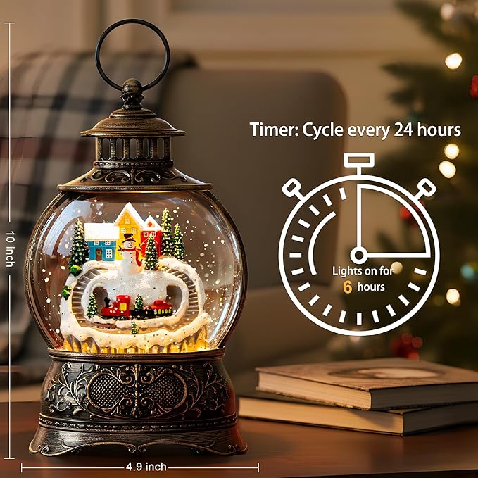 - Music & Timer Features: Easily control your snow globe with the switch located on the base, offering three modes: Light with Music, Light Only, or Off. The built-in timer automatically turns the lantern off after 6 hours and back on after 18 hours, providing hassle-free operation and energy savings for your holiday celebrations.