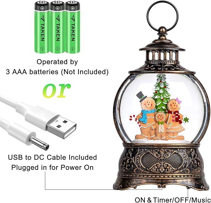 - Dual Power Options: Power your snow globe lantern effortlessly with two convenient options. Use the included USB cable for continuous operation without batteries, ideal for fixed setups. Alternatively, power it with 3 AAA batteries (not included) for flexible placement anywhere in your home, no outlet required.