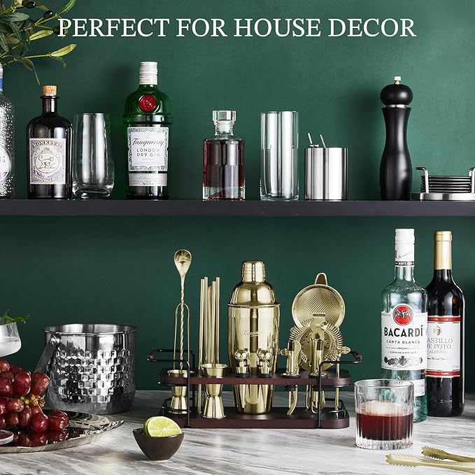 KITESSENSU Cocktail Shaker Set Bartender Kit with Stand | Complete 24-Piece Bar Set Cocktail Kit with All Bar Accessories, Gold