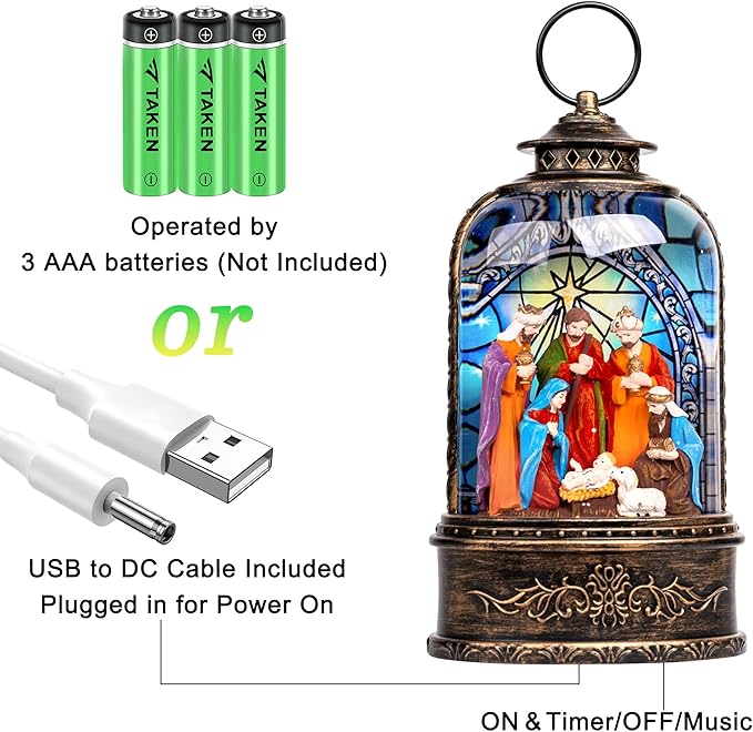 - Dual Power Options: Power your snow globe lantern effortlessly with two convenient options. Use the included USB cable for continuous operation without batteries, ideal for fixed setups. Alternatively, power it with 3 AAA batteries (not included) for flexible placement anywhere in your home, no outlet required.