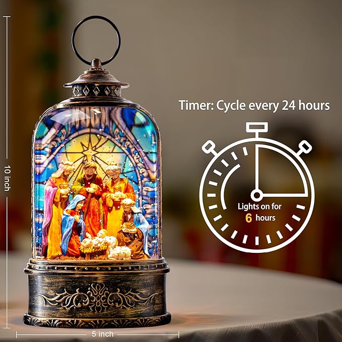 - Enchanting Holiday Charm: Inside this stunning Christmas snow globe water lantern, a sacred nativity scene glows with the Holy Family, including baby Jesus, Mary, and Joseph, surrounded by wise men and gentle lambs. The vibrant stained-glass effect backdrop enhances the festive ambiance, while swirling glitter mimics a soft snowfall, illuminated by warm LED lights. The built-in speaker plays peaceful holiday melodies, making it a perfect addition to your seasonal mantel or tabletop decor.