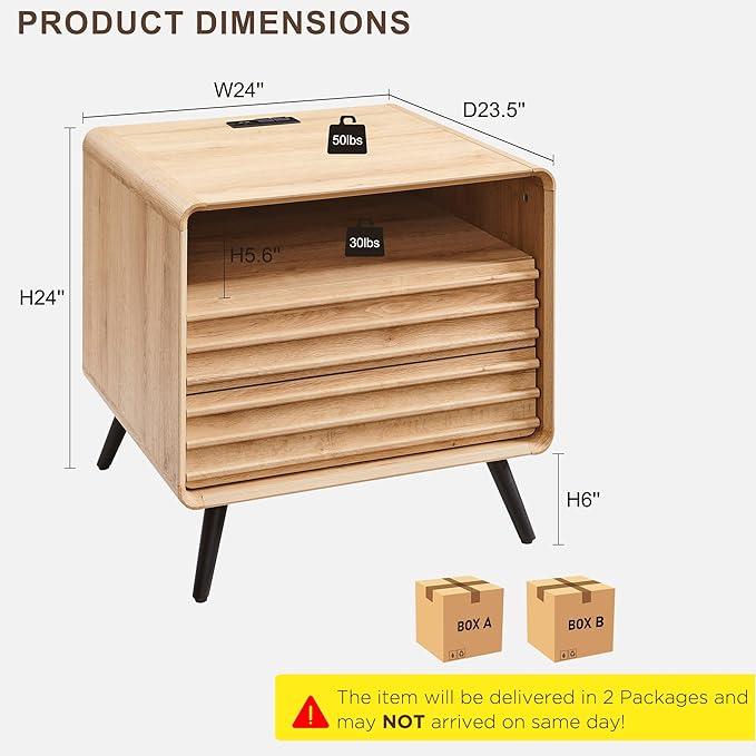 - 24-inch Desktop with Charging Station: The fluted nightstand size is 23.5W*24D*24H, providing a 24-inch square large and spacious desktop, which can place mobile phones, laptops, desk lamps and other daily necessities at the same time without crowding . In addition, the top panel of this night stand with charger station is equipped with 2 AC sockets and 2 USB ports. Let you say goodbye to the trouble of finding a charging socket.