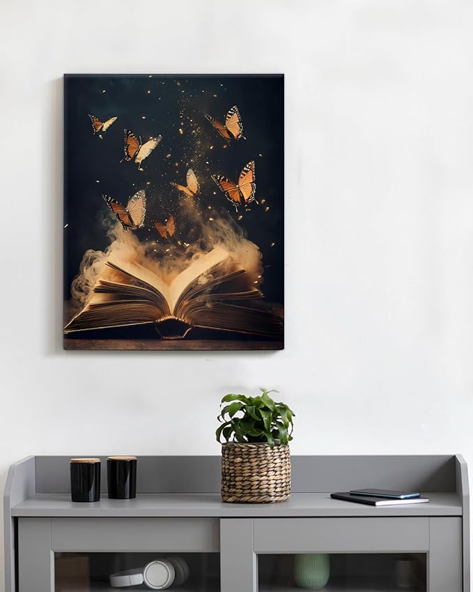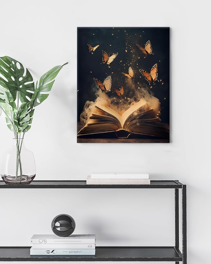Aesthetic Book Butterflies Wall Art Decor Vintage Dark Academia Canvas Print Poster Framed Picture Painting for Home Reading Corner Library Decor 8x10 Inch, Gifts for Book Lovers Bookworms