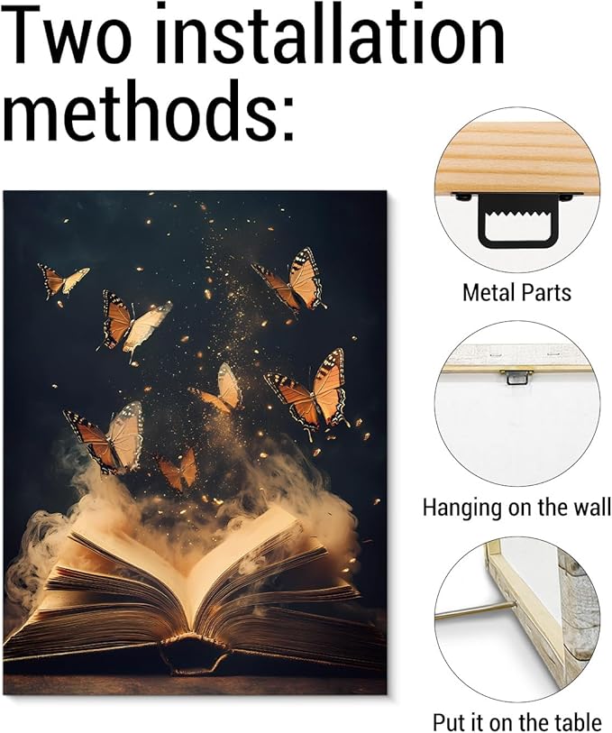 Aesthetic Book Butterflies Wall Art Decor Vintage Dark Academia Canvas Print Poster Framed Picture Painting for Home Reading Corner Library Decor 11x15 Inch, Gifts for Book Lovers Bookworms