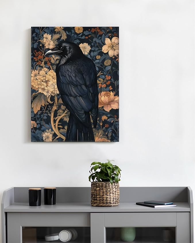 Aesthetic Raven Floral Wall Art Decor Vintage Raven Cottagecore Canvas Print Poster Dark Academia Framed Painting Wall Decoration for Home Farmhouse Living Room Bedroom 11x15 Inch