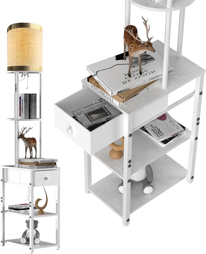 - 💡【Lamp&Storage Design】Lightdot floor lamp with table and drawer features a 4-tier sturdy solid wood boards and a cylinder fabric lampshade, a circular storage table above can perfectly display decor like photo frame, and plants. The lower shelves with drawer is suitable for collecting books, and sundries such as charging cables. Combining storage and illumination into one space-saving solution, it provides ample lighting while freeing up valuable space in your living room or workspace.