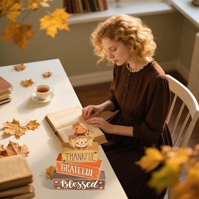- Fall Wooden Table Decorations: you will receive a set of 4 fall table centerpiece with a scarecrow and 3 stacked block sign, offering you multiple elements to employ in your decorating adventures; Stacked blocks are printed with thankful grateful and blessed, nice addition to your fall decor nice addition to your fall decor