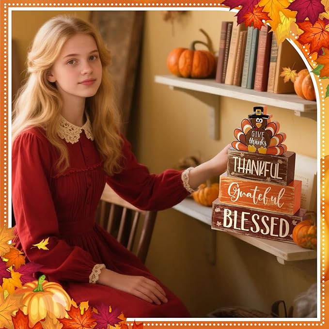 - Thanksgiving Wooden Table Decorations: you will receive a set of 4 Thanksgiving table centerpiece with a turkey and 3 stacked block sign, offering you multiple elements to employ in your decorating adventures; Stacked blocks are printed with thankful grateful and blessed and turkey decor is printed with [give thanks], nice addition to your fall decor nice addition to your fall decor