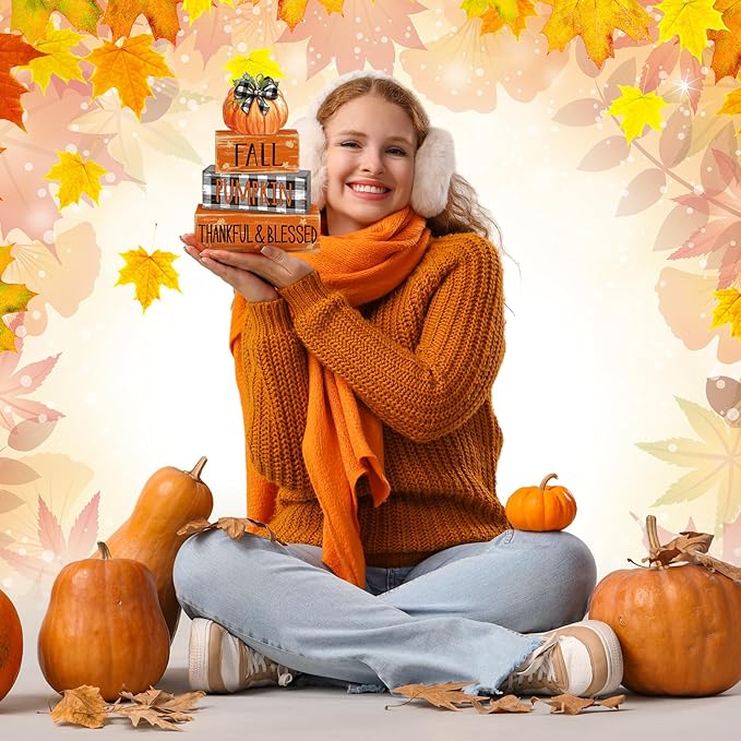 - Fall Wooden Table Decorations: you will receive a set of 4 autumn table centerpieces with a pumpkin and 3 stacked block sign, offering you multiple elements to employ in your decorating adventures; Stacked blocks are printed with [thankful blessed], nice addition to your fall decor nice addition to your fall decor