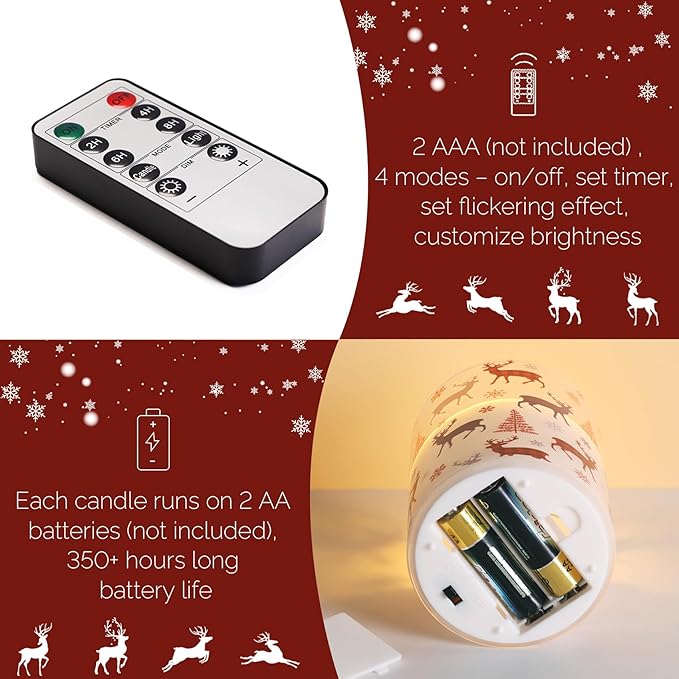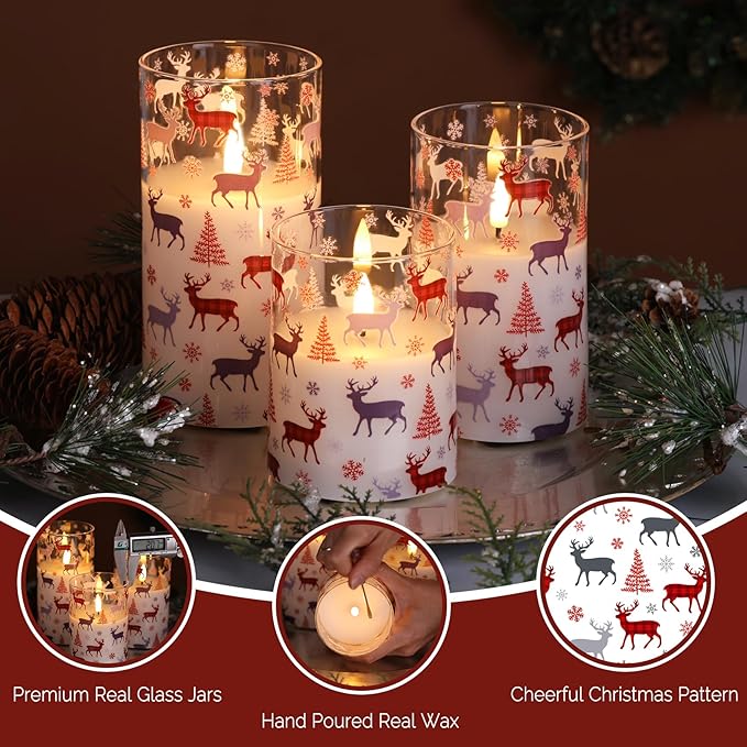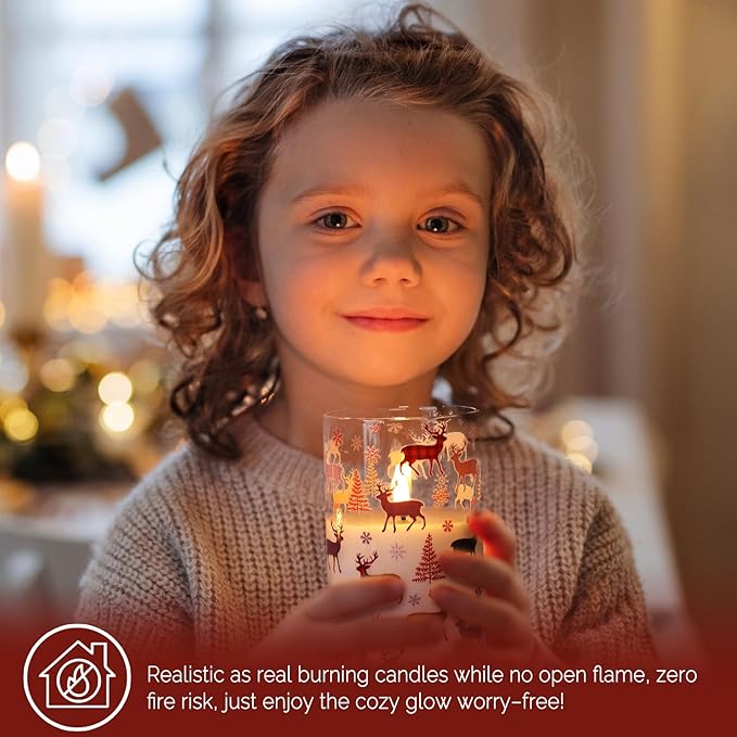 - Realistic Christmas Flameless Candles - Featuring festive Christmas designs like buffalo plaid deer, red trees, and snowflakes, our glass flameless candles with a realistic black wick flame bring the cozy, lifelike charm of real candles to any space.