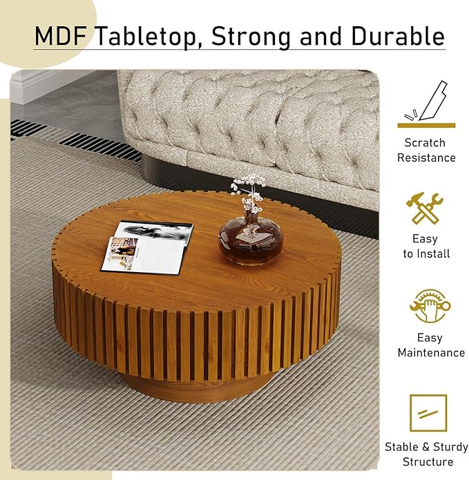 - High-quality Material: The tabletop and base of the drum coffee table are crafted from high-quality MDF material, ensuring durability and stability. The tabletop edges of the round coffee table are adorned with intricate groove relief embossing, delicate craftsmanship adding a unique texture and artistic beauty. The round coffee table stands on a sturdy pedestal base, providing reliable support and stability