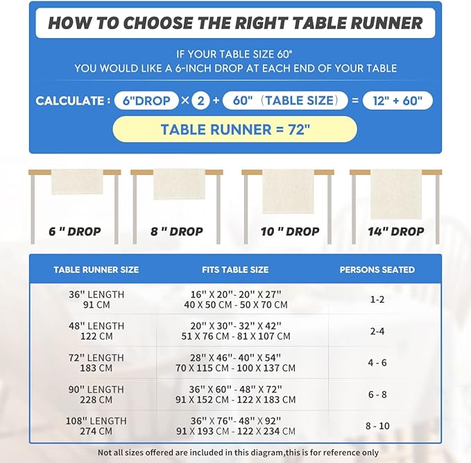 - Fits Table Size : This table runner is 12 x 72 inch, appropriate for a table that can seat 4-6 people, better match your table and give you a delightful dining experience