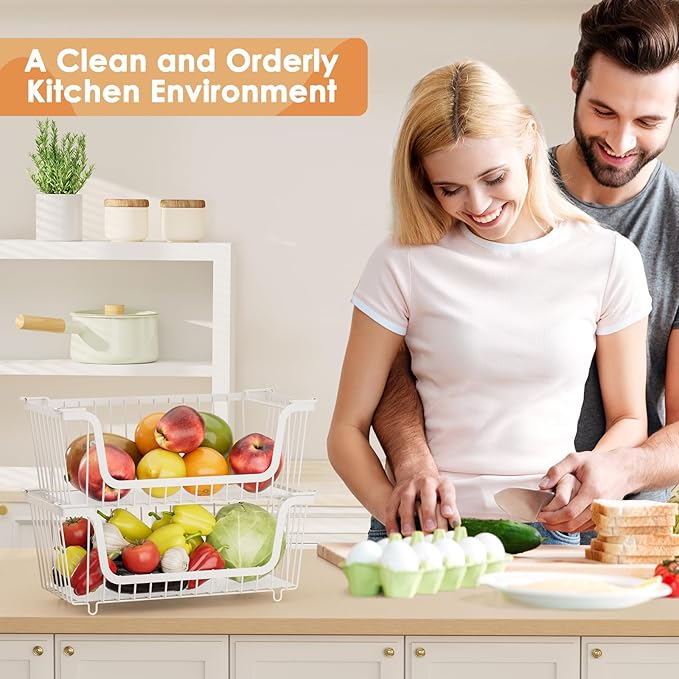 - DURABLE CONSTRUCTION: Our kitchen wire baskets are crafted from upgraded, thickened wire, offering superior strength.This upgrade boosts load-bearing capacity and ensures secure stacking.The smoothly polished and painted finish prevents rust and safeguards counter surfaces.Care is simple—just wipe with a damp cloth.
